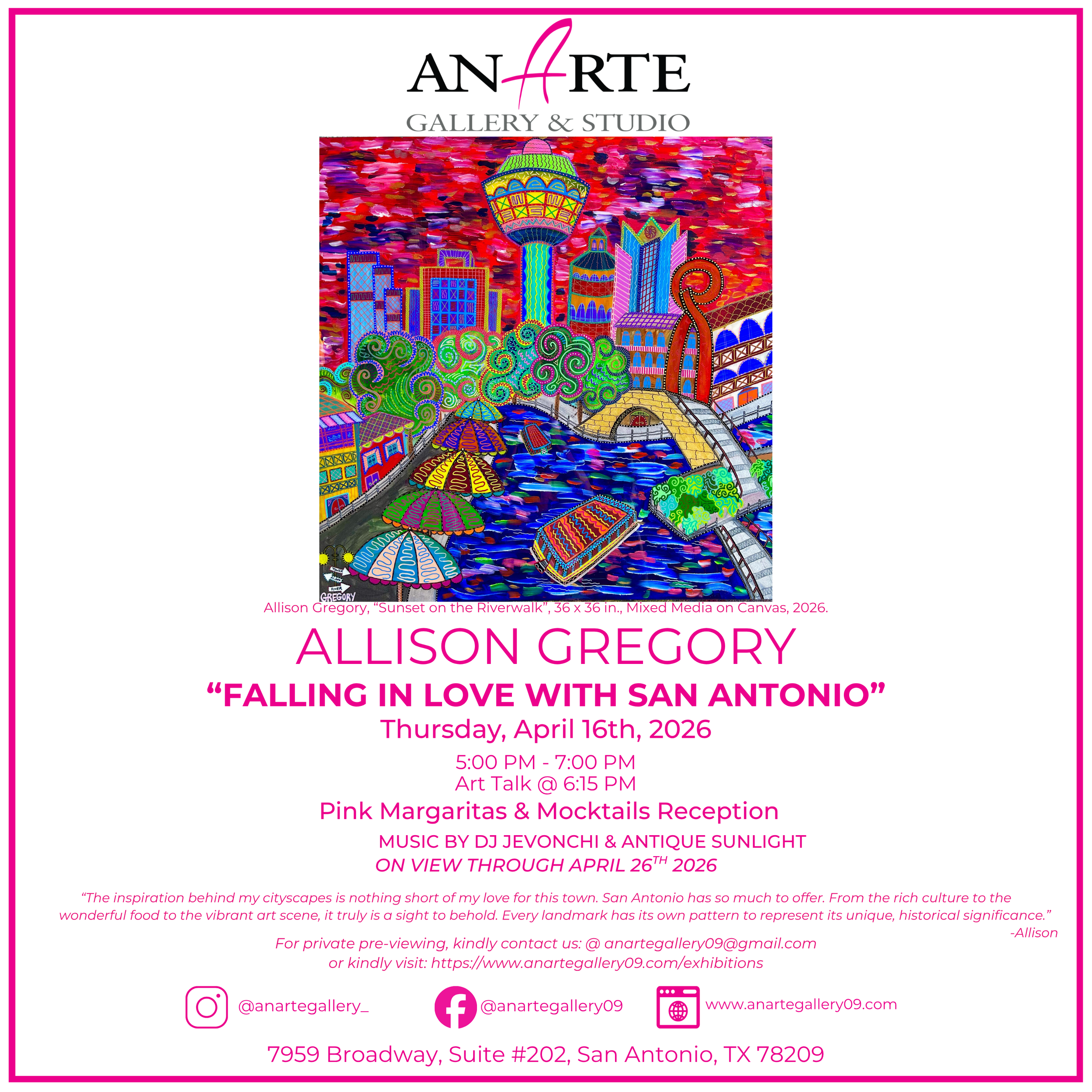 AnArte Gallery is excited to present Allison Gregory’s solo exhibition, Falling in Love with San Antonio. Please join us for an opening artist reception featuring Pink Margaritas & Mocktails, music by Jevonchi, and Antique Sunlight, Art Talk at 6:15 PM.